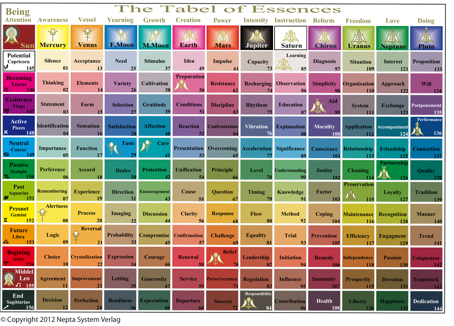 The Table of Essences includes a complete mosaic of human essences. It is arranged in user-friendly rows and columns, with all of the elements (essences) that constitute a whole human being appearing at the junctions of the horizontal rows and vertical columns.